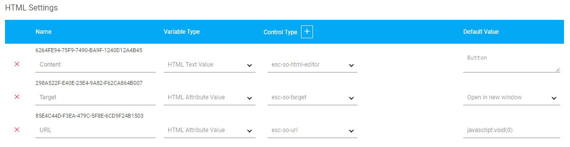 The settings will be generated on a table which has a few column, Name, Variable Type, Control Type, Default Value.